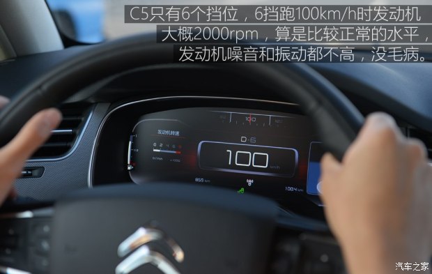 雖然C5的變速箱還是只有6個(gè)擋位,但6擋跑著100km/h的時(shí)候發(fā)動(dòng)機(jī)轉(zhuǎn)速大概2000rpm,算是比較正常的水平,發(fā)動(dòng)機(jī)噪音和振動(dòng)都不高,沒毛病。如果想加速的話,輕踩油門至三分之一深度,車輛會很淡定地維持在6擋,不過實(shí)際加速表現(xiàn)卻也還行。