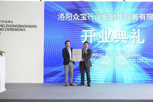 寶馬(中國(guó))汽車貿(mào)易有限公司西區(qū)銷售經(jīng)理 楊筱剛先生(左)向洛陽(yáng)眾寶行汽車銷售服務(wù)有限公司總經(jīng)理 白冰先生(右)正式授權(quán)